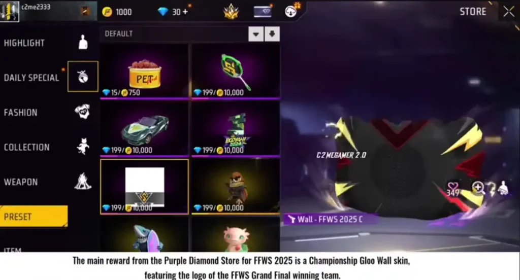- FFWS 2025 Champion Glue Wall Skin (Free Fire World Series 2025 themed).
